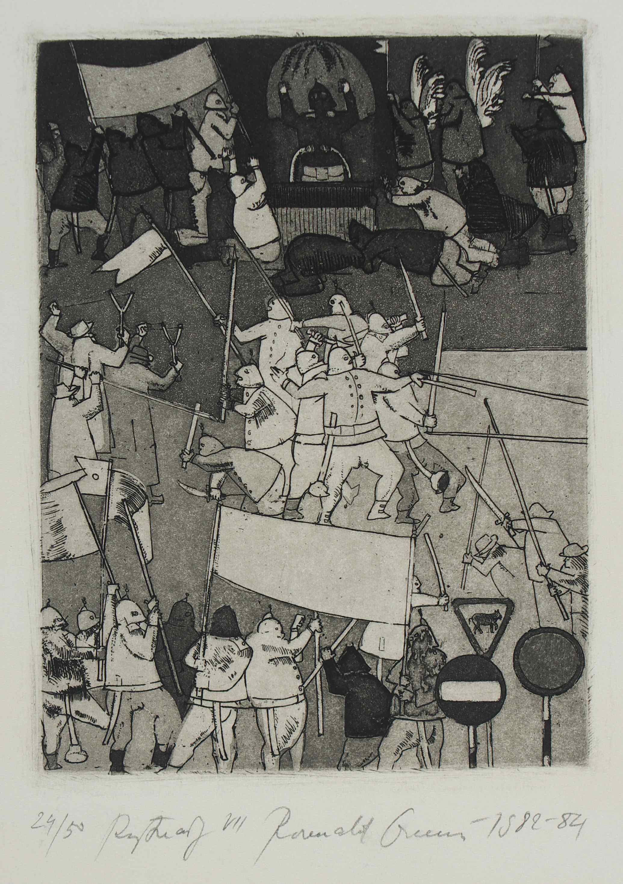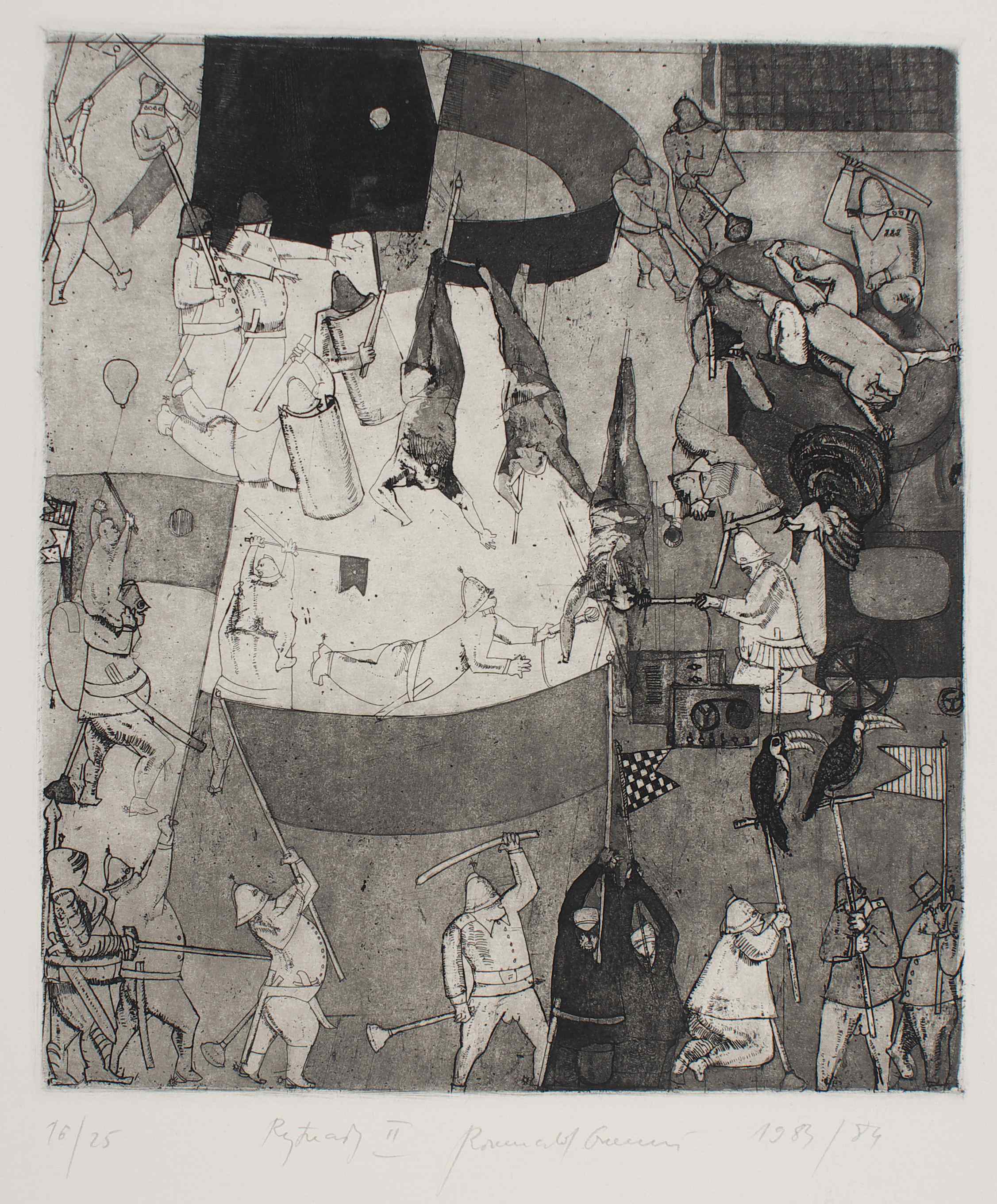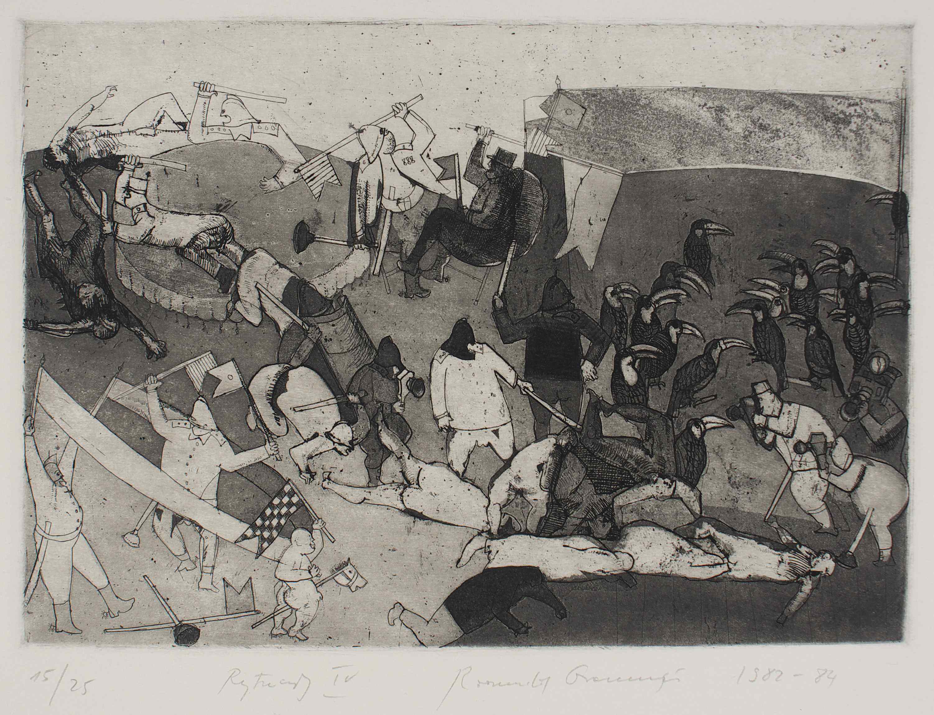 Oramus napisał (…) grafiki  pierwszej serii wykonywane były w odległości 2-3 metrów od  bojowych oddziałów, w małych grupkach przemierzających tupotem żołnierskich butów po  krakowskiej Alei Trzech Wieszczów w czasie godziny milicyjnej stanu wojennego w latach 1981-83.  W tym czasie tam bowiem mieszkałem na parterze międzywojennej kamienicy. Mój stół do pracy stał tuż przy oknie. Przez uchyloną zasłonę, przy lekko świecącej lampie miałem znakomite pole obserwacji karykaturalnych postaci w misiowych czapkach, i wygiętymi pałkami u pasa. W wyobraźni stawały się one bardziej szczotkami - wyciorami do czyszczenia klozetów, czy też pompkami do przetykani zatkanych umywalek. Rynsztunek wojskowy, zrzuconych do miasta chłopaków z różnych części kraju, imaginacyjnie stawał się też skrzyżowaniem munduru generalissimusa i herosa ochotniczej straży pożarnej. Nad wszystkim zdawało się widzieć fruwające latawce politycznego okrucieństwa i ludowej przaśności. Zamiast wrony jedynie tukany i papugi – ptaki wyjątkowo dziobate, jakby krakały, bądź paplały zadekretowaną melodię (…). [ zob. str. oramus.art  Refleksje:  R. Oramus, Szalone lata 80. i 90.]