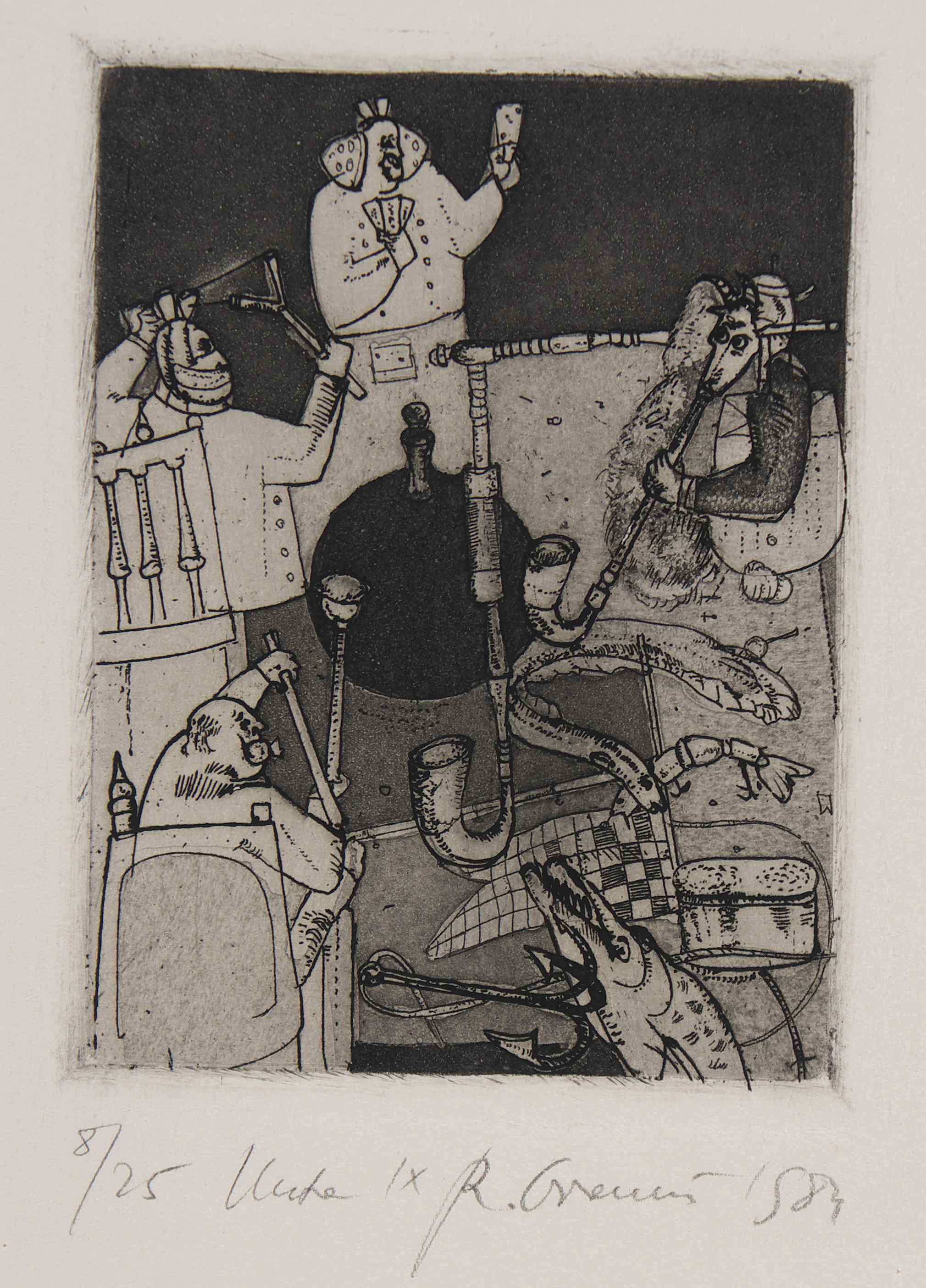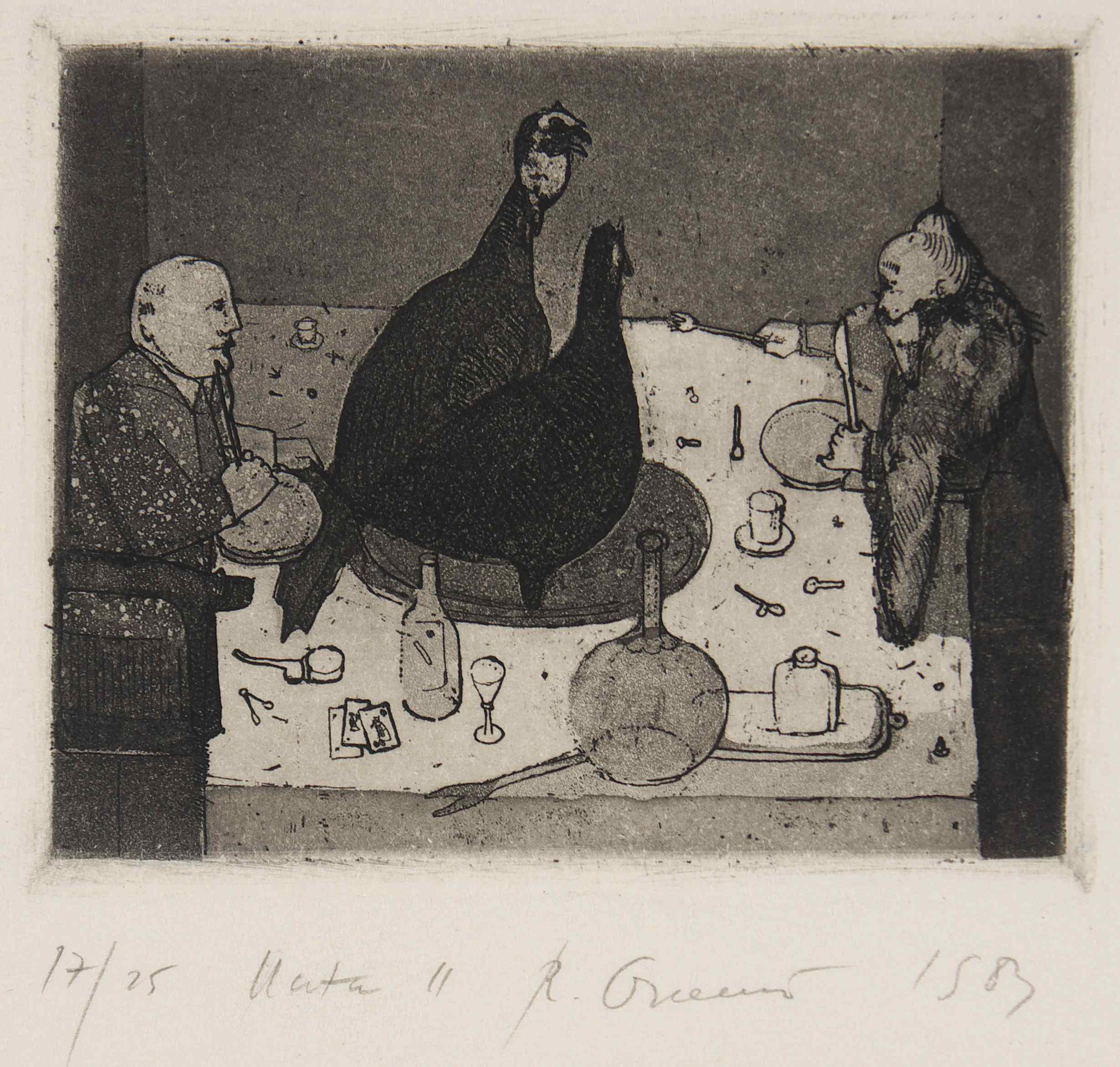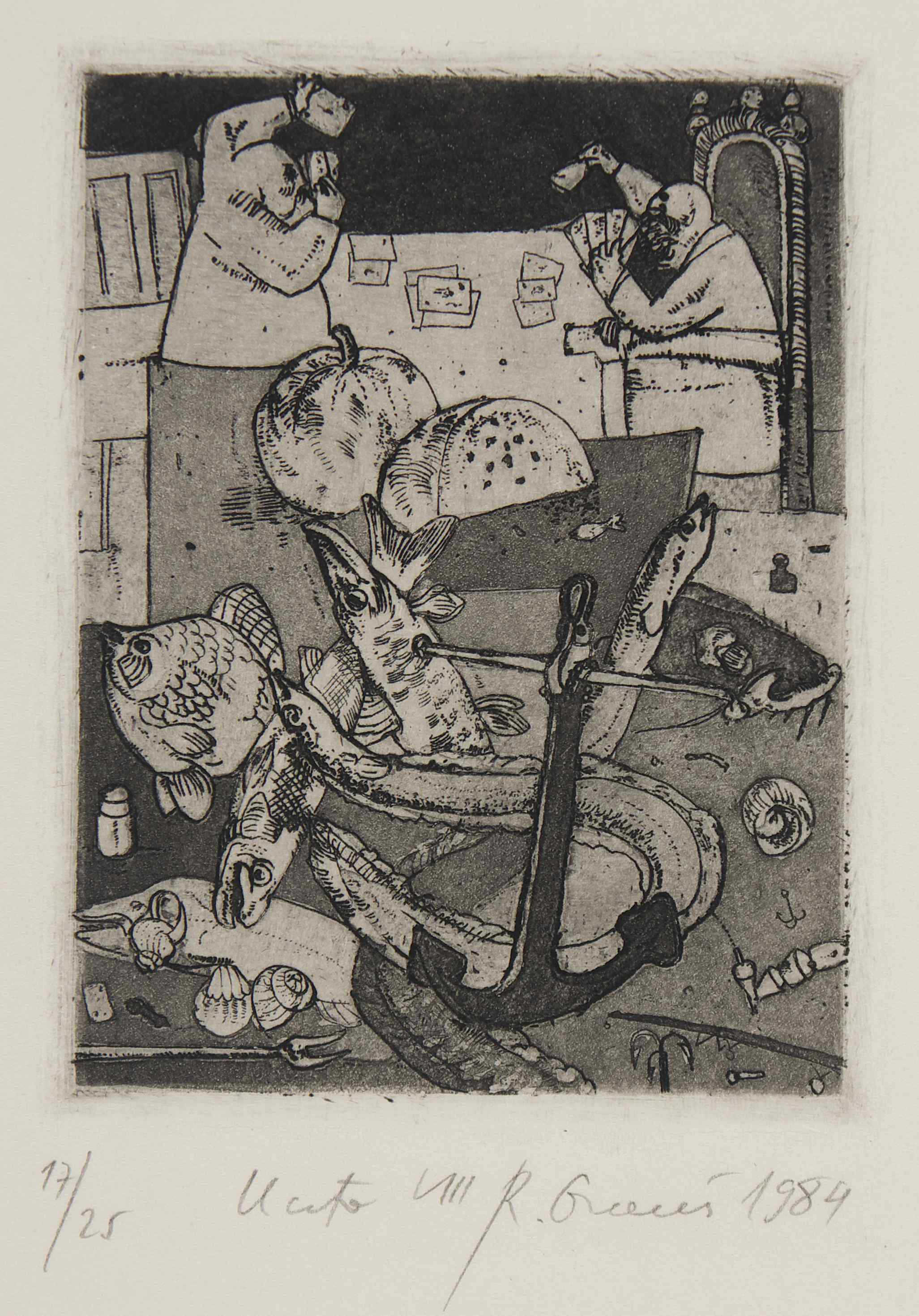 Zaś na temat powstania cyklu Uczta : (...) Lata 80 i 90. to nie tylko czas politycznej konfrontacji, ale także czas prozy życia. Uciążliwości reglamentacji brakujących produktów, szarzyzny otoczenia, bezsensu lub ograniczenia życiowych celów. Rytowane  i malowane uczty są groteskowym obrazem pragnienia konsumpcji w czasie kryzysu. Walka i zabiegi o podstawowe spożywcze produkty przybiera tu znamiona pojedynku małej grupy ludzi, najczęściej dwojga lub trojga siedzących za wspólnym stołem. Usadowieni, uzbrojeni w noże i widelce,  przy pustych lub suto zastawionych, wydłużonych stołach,  prowadzą swoisty dialog absurdu. Karykaturalnie przedstawieni są paradoksalnie osaczeni nadmiarem dóbr, takich jak ponadwymiarowe indyki, gęsi, wszelakie ryby, kawał wołu lub wieprza. Na tych  stołach, spłaszczonych i widzianych jakby z góry znajdują się jeszcze najbardziej niestosowne przedmioty i rekwizyty. W nadrealistycznym zestawieniu egzemplarz codziennej prasy, kotwice, sieci rybackie, karty do gry, drobne codzienne utensylia, stolarsko- rzemieślnicze narzędzia, zderzone są znaczeniowo z wszelakimi okruchami i odpadami życia. Rytuał gloryfikacji upragnionego jadła ma tu charakter misteryjny. Za stołem odbywa się swoista bałwochwalcza modlitwa, w której dobra konsumpcji to odpowiednik kultu złotego cielca (…) [ zob.  j.w. str. oramus.art  Refleksje]