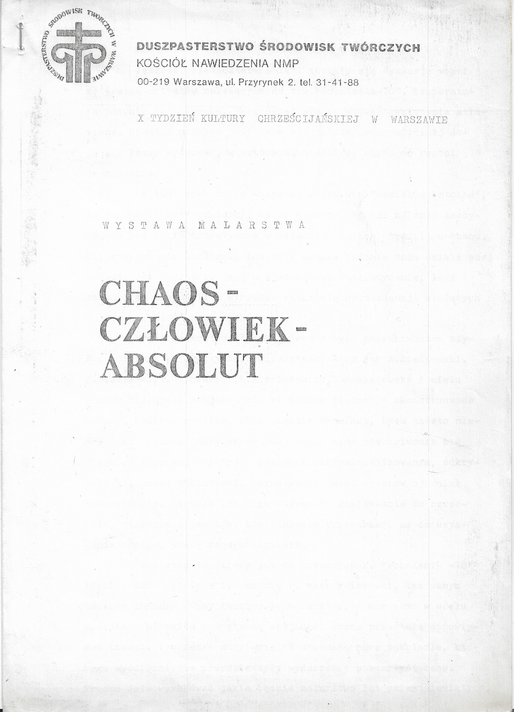O artyścieBibliografiaKatalogi, foldery, druki towarzyszące wystawom indywidualnym i zbiorowymChaos – Człowiek – Absolut Chaos – Człowiek – Absolut. Wystawa malarstwa; druk towarzyszący wystawie, tekst: Joanna i Paweł Sosnowscy; Kościół Nawiedzenia NMP, Warszawa 1984